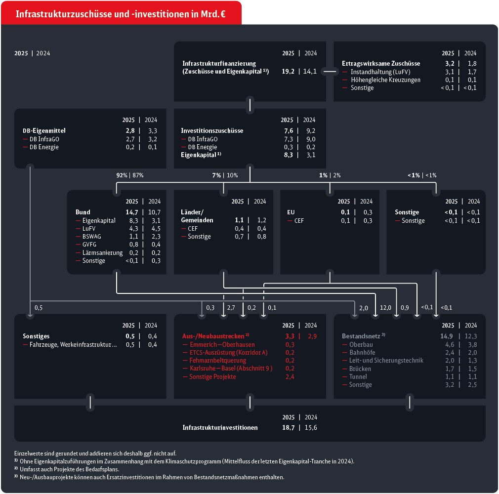 Von den Investitionszuschüssen, die der DB-Konzern 2025 erhielt (7,5 Mrd.€), entfiel der überwiegende Teil auf die Infrastruktur. Die wichtigsten Finanzierungsquellen für Investitionen in die Infrastruktur sind Zuschüsse des Bundes, gefolgt von Ländern und Gemeinden.