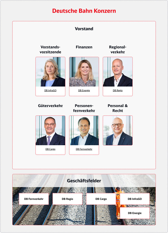 - Schlagkräftige Organisation: Unser Ziel ist es, die Schlagkräftigkeit des DB-Konzerns durch den Aufbau einer modernen und effizienten Organisation sowie die Verankerung einer wertorientierten Unternehmensführung zu sichern.